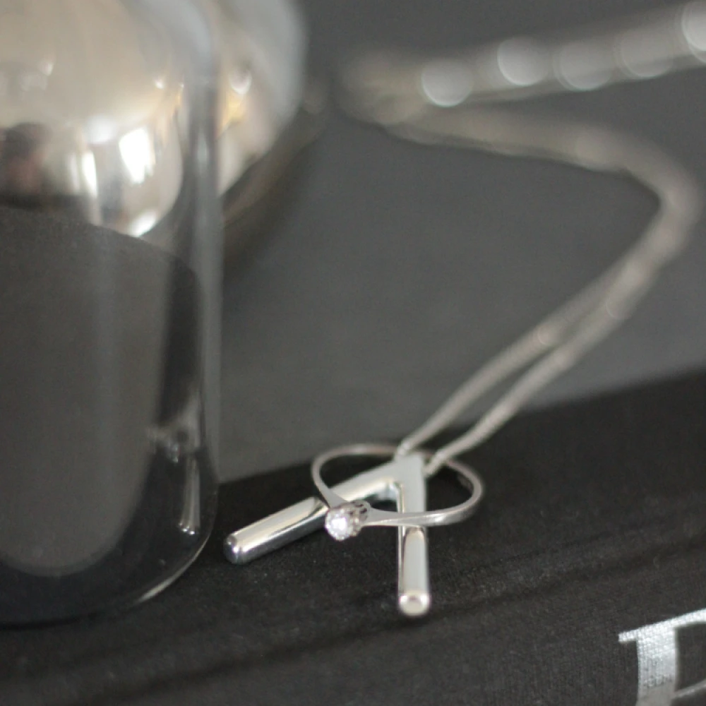 or are not allowed to have your ring on your finger. The holder and the necklace are made of fine silver and the smart design makes it easy to put the ring on or take it off without needing to open the necklace.