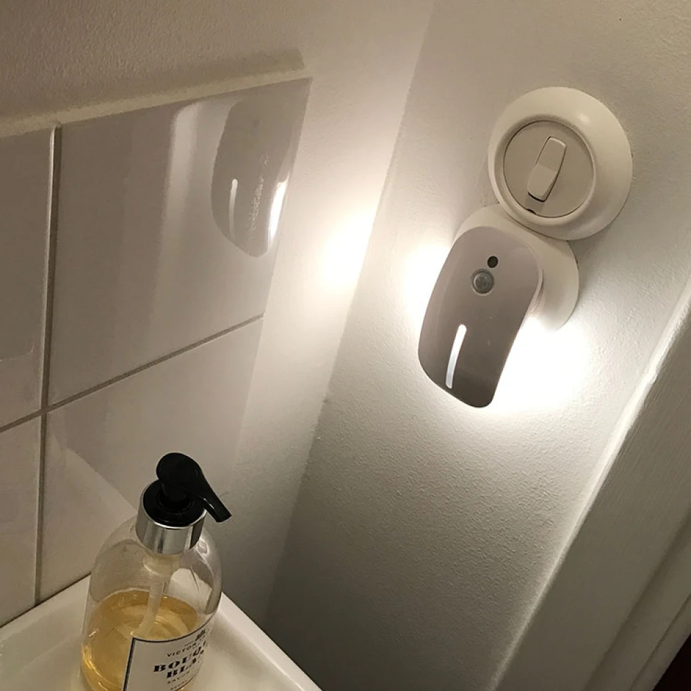 The night light is plugged straight into the wall socket and has both a motion and a light sensor. Switch between two settings on the back of the night light.