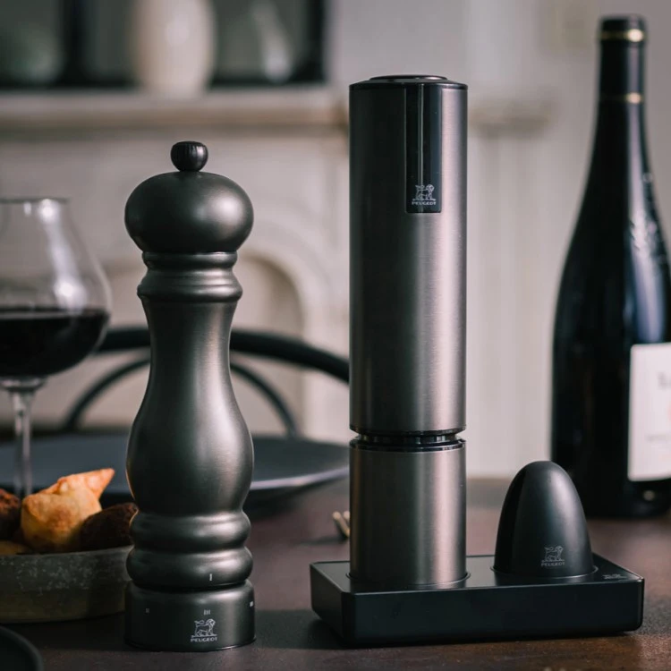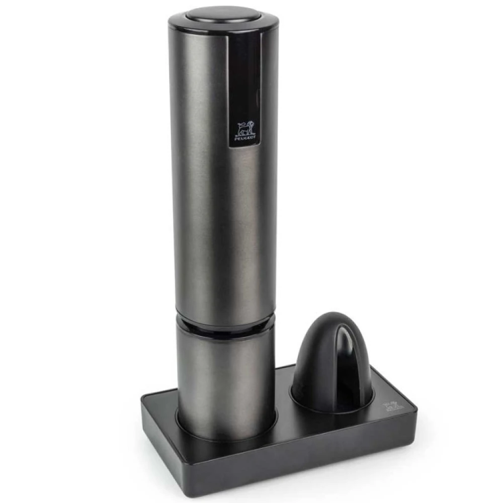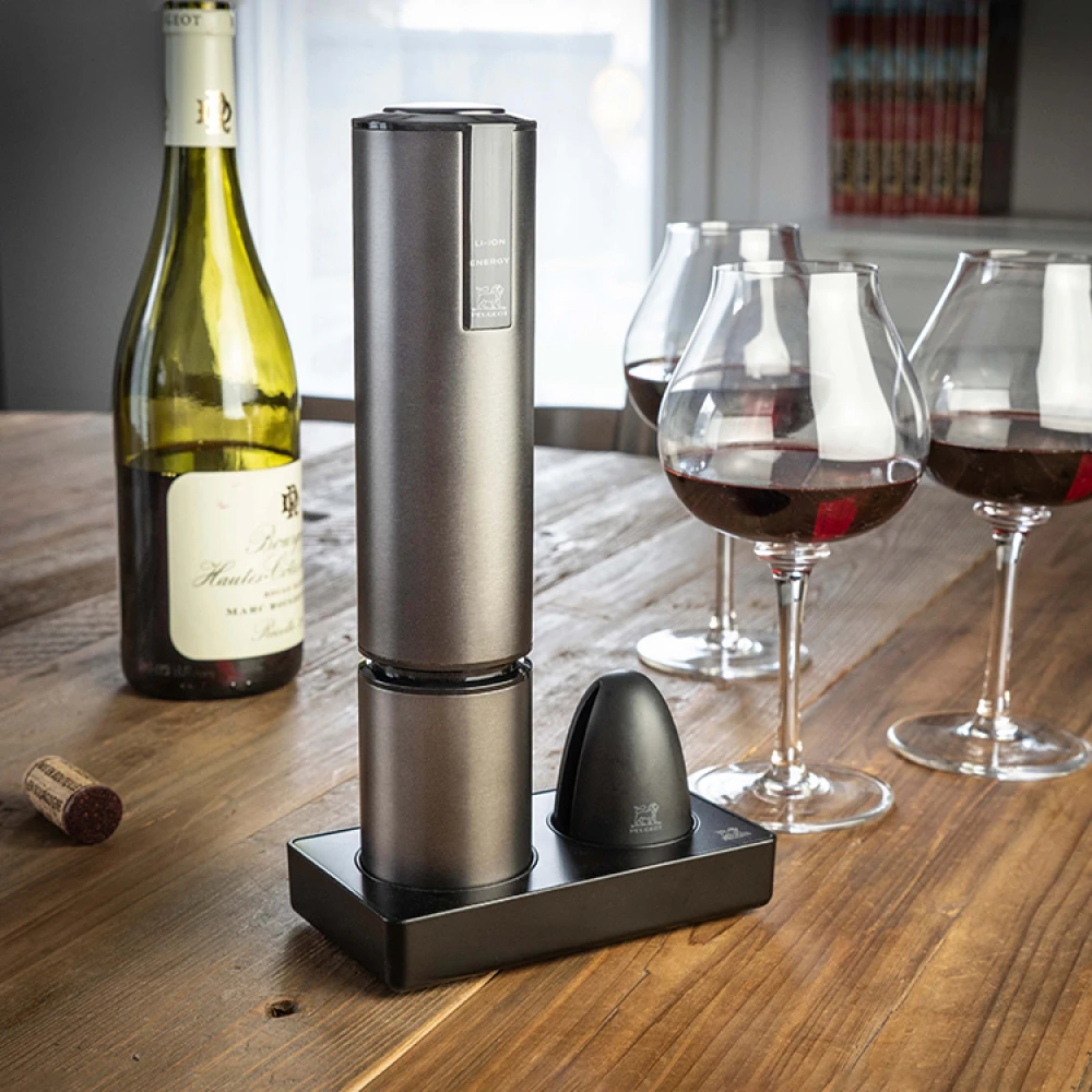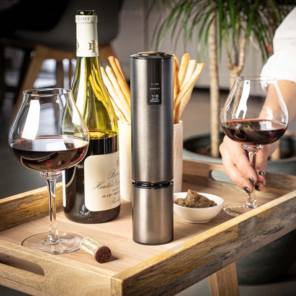 Elis Touch is an elegant wine opener set with a foil cutter and a rechargeable electric wine opener from the French company Peugeot. The electric wine opener’s built-in corkscrew works on corks of any material and allows you to uncork your wine bottle in just seconds.