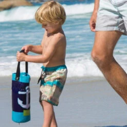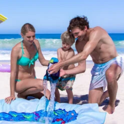 The pool- and beach blanket is a smart, combined, picnic blanket and beach pool, all in one. The beach blanket is not only smart to sit on but can also be turned around and used as a child pool. Dig a pit, place the pool, then fill up with water.