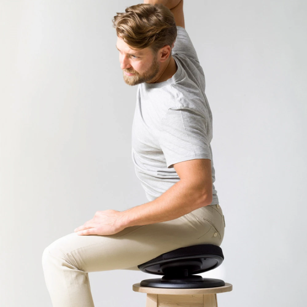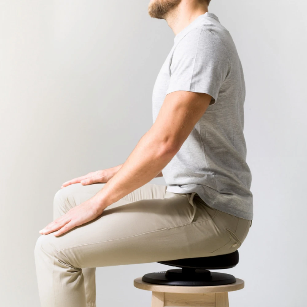 The unstable seat can tip in all directions. This means that you constantly need to use your muscles to sit straight on the chair. At first, it’s hard just to sit straight. But as you build muscle, you’ll feel ready to up the challenge. Try sitting straight with only one or neither foot on the ground, for example.