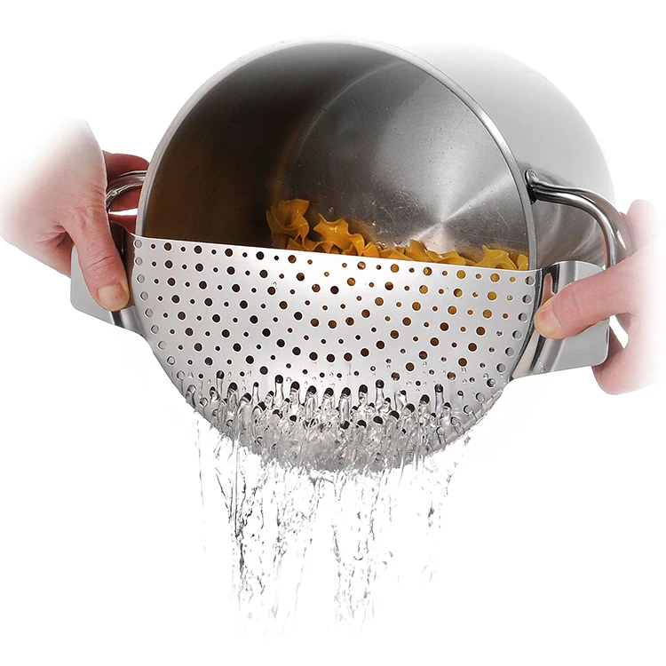 The flat strainer is extremely easy to use; just place it over the pot like a lid so that it covers the side you will be straining the water from. The handles are fitted on the sides of the strainer and by grabbing the pot and strainer handles at the same time you can pour off any water while keeping your pasta or potatoes safely in the pot.