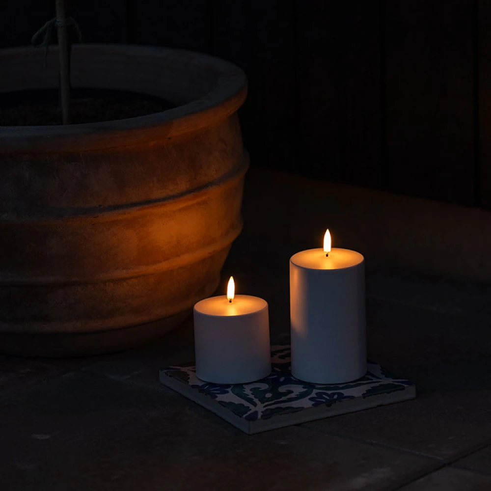 The block candle is made of UV-resistant plastic and can be used outdoors. The light is water splash resistant, which means that it can withstand a little rain, but you may wish to place it inside a lantern to protect it from water and puddles. The light should be taken inside in the event of snow and minus temperatures.