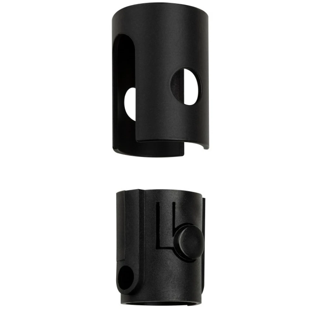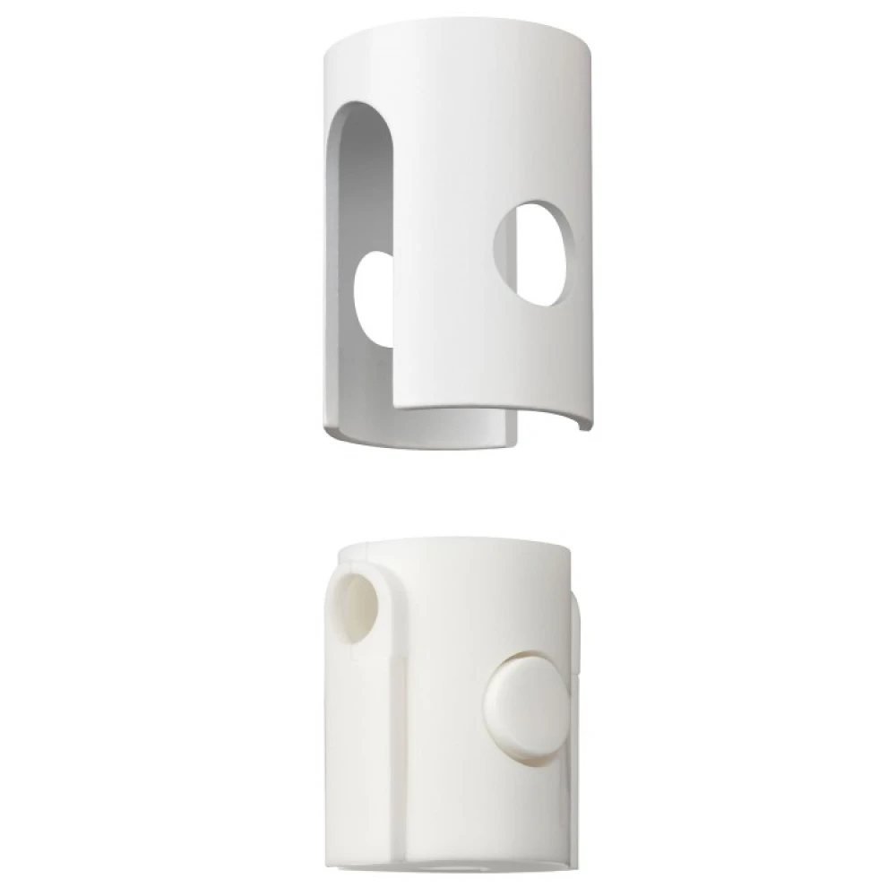 Remove the plastic holder from the metal bracket. Remove the thin plastic cover on one side of the plastic holder with a knife so that you can thread the cord straight through the plastic holder. Thread the cord through the plastic holder, put the two plastic parts together and use the small white plug that comes with it to close the hole in the base. Place the plastic holder back in the metal bracket.