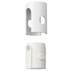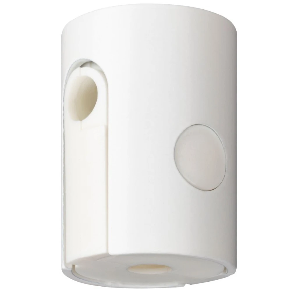 The Punkt ceiling mount consists of a metal bracket and a two-part plastic holder through which the cord is threaded. Attach the metal bracket to the ceiling with a suitable screw. Remove the plastic holder and attach it to the metal bracket by pressing the buttons on the side of the two-part plastic holder.