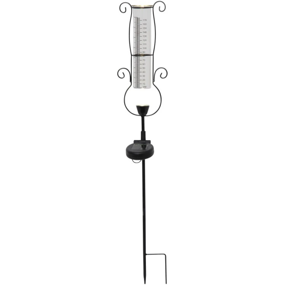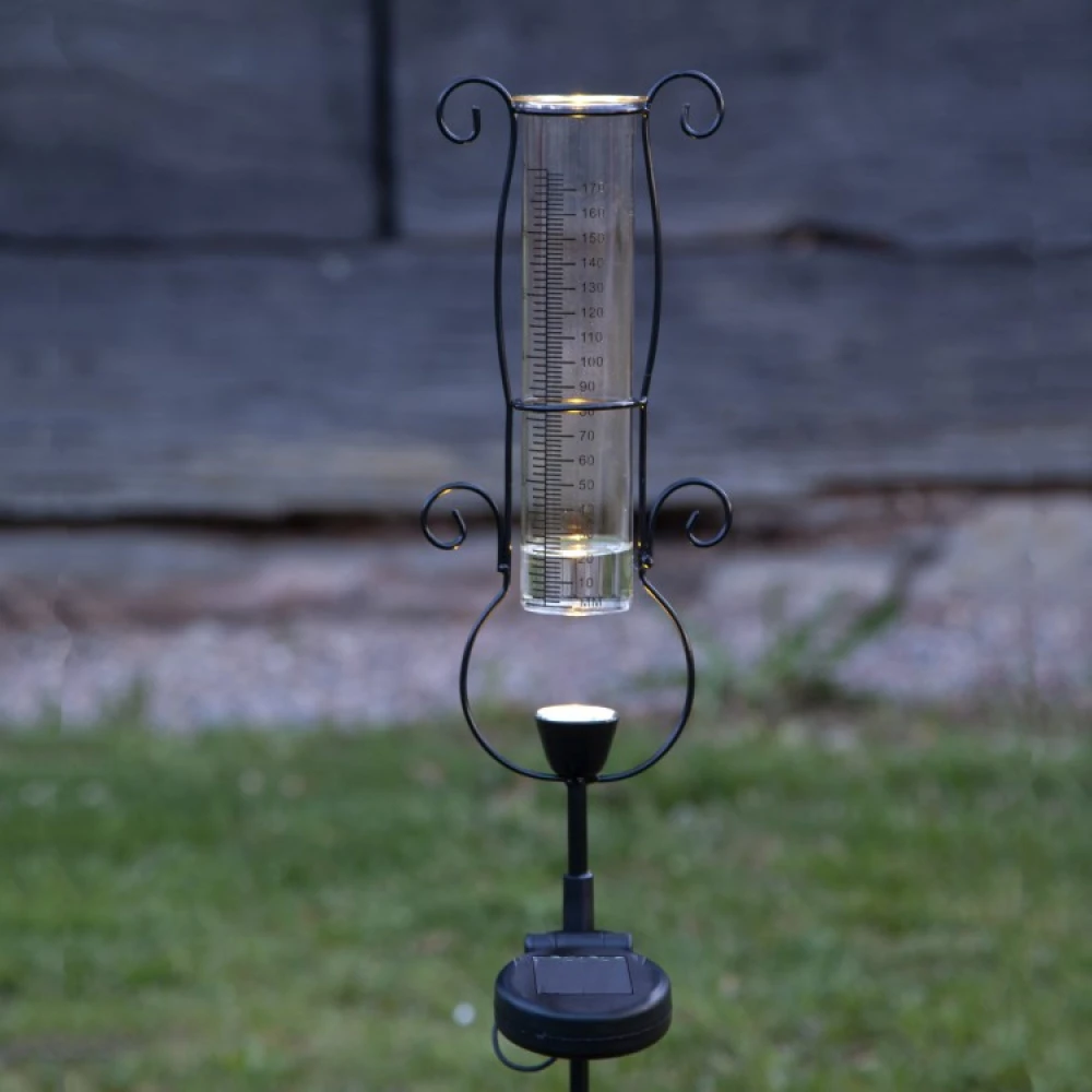 The rain gauge is made of glass and graduated in millimetres (0-176 mm) and inches (0-7 inches). The glass beaker holds about 33 cl and with the help of the rechargeable solar lamp it is easy to read how much it has rained.