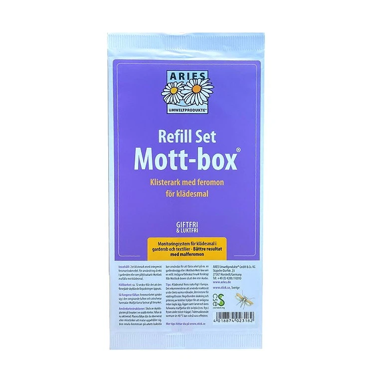 Practical refill packaging with 2 extra sheets for your Mottlock clothes moth trap. The sticky sheets contain pheromones that attract the moths and ensure that they get stuck inside the trap.