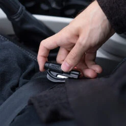Remove Resqme from the clip, the built-in knife is then exposed and can quickly cut off the seat belt. Then press the round black head of the tool against one corner of the side pane. A spring inside Resqme shoots out a powerful steel nail and breaks the glass.
