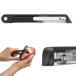 The Sharple potato peeler is a self-sharpening peeler with a ultra-sharp Japanese stainless steel blade. Every time you open or close the blade cover, the potato peeler is sharpened by the built-in blade sharpener, ensuring you always have a freshly sharpened blade when peeling potatoes, vegetables and root vegetables.