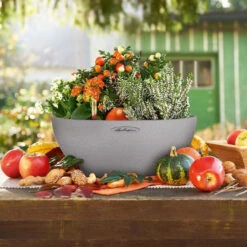 The exterior of the round self-watering pot imitates rustic stone and is made of weather-resistant, high-quality plastic. The pot is manufactured by the German company Lechuza and is available in two sizes.