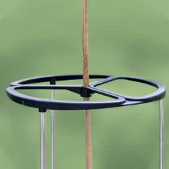 The plant is offered support with three long metal bars you place in the soil. The bars are held together with plastic rings in different sizes located on different levels. The rings also have a hole in the middle where you can thread a bamboo stick (not included) for further support.