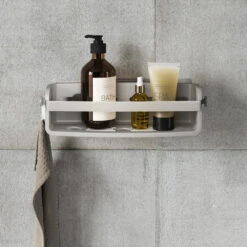 The Umbra shower shelf with suction cups is an easy-to-mount bathroom shelf that you can set up without the use of tools. The shower shelf has space for shampoo, conditioner and shower gel, it has a holder for a razor and two hooks on the sides where you can hang a sponge, for example.