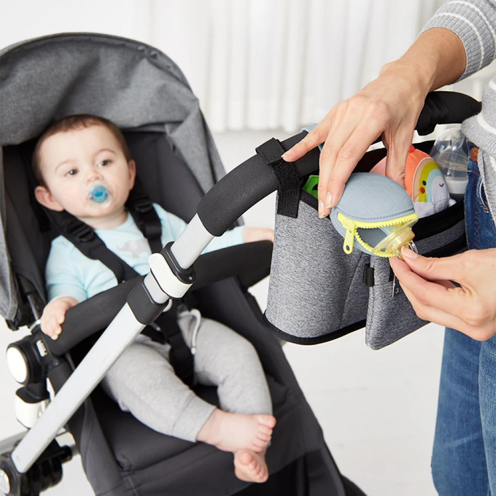 The case is made of soft food-grade silicone and has a sealed zip to keep the dummies clean. The practical clip can be used to attach the dummy case around the handle of the pram or pushchair, onto your changing bag, rucksack or handbag. That way you always know where the dummies are and can grab one any time you need.