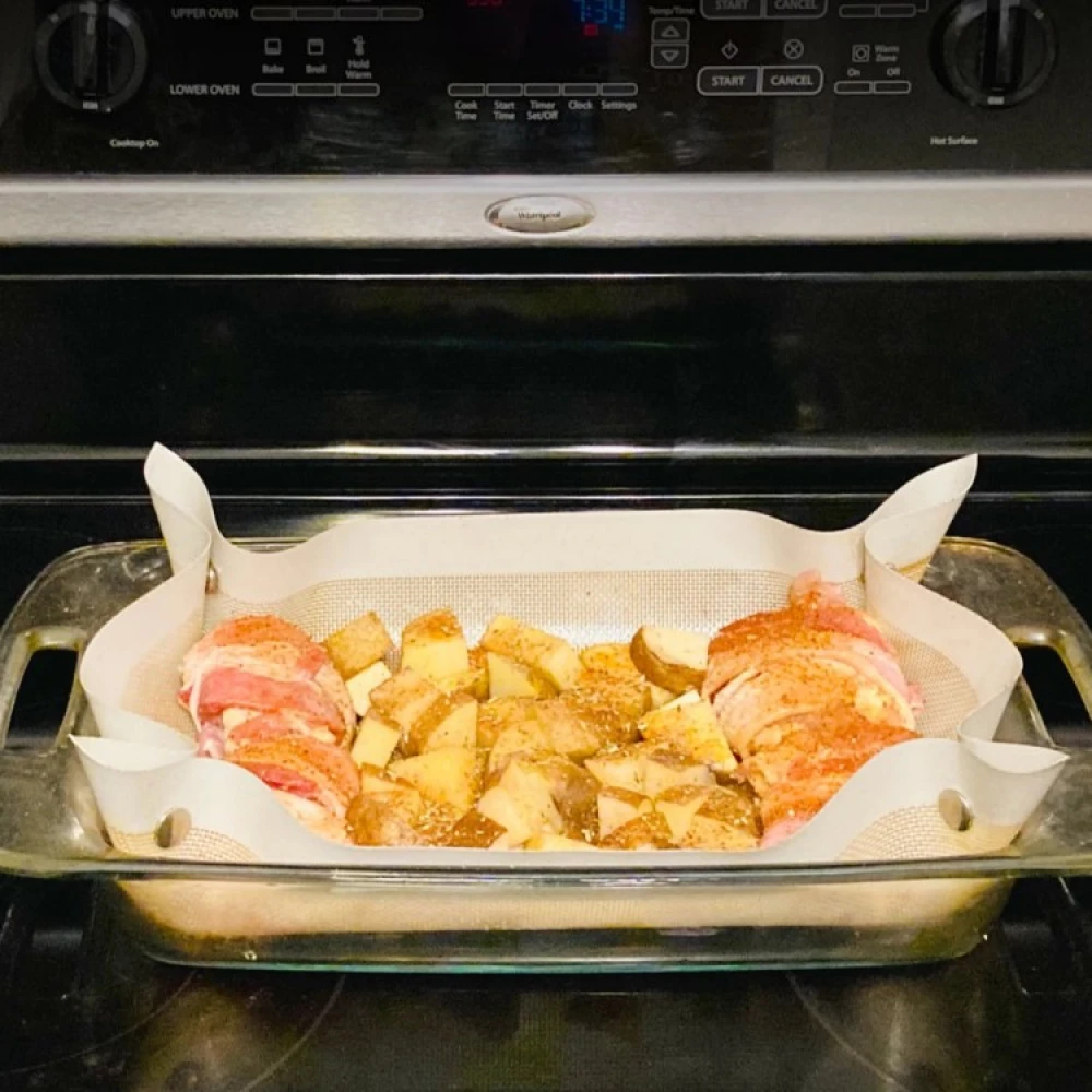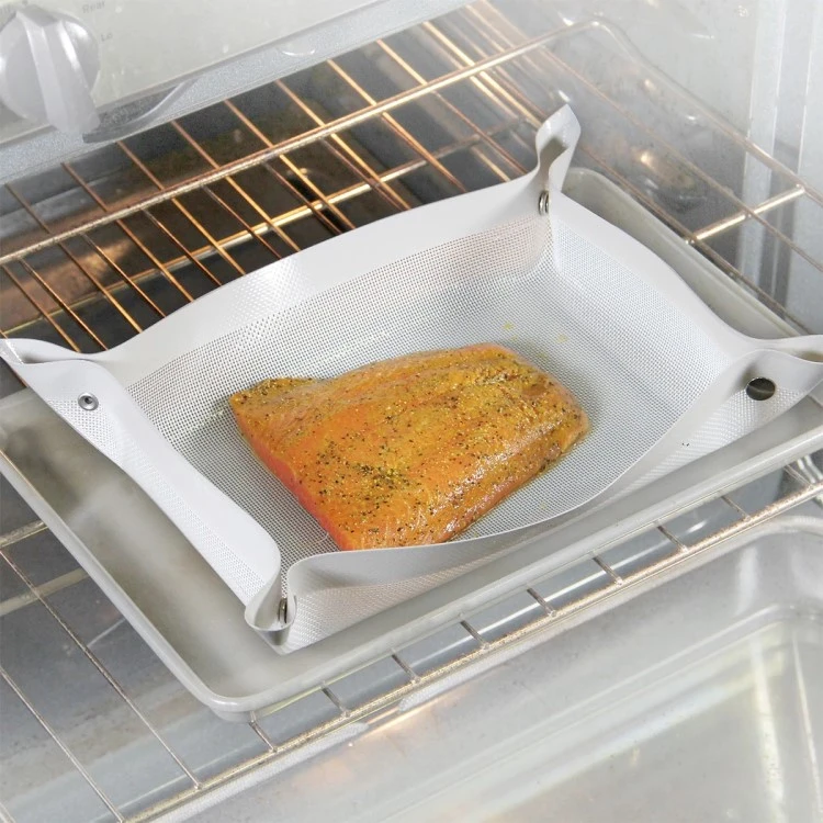 This ovenproof silicone mat can be quickly converted from an oven mat to a leak-proof baking dish. By snapping the buttons in the corners together, the mat becomes an ovenproof dish in which you can cook all kinds of delicious dishes.
