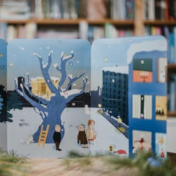 Snällkalendern har ett praktiskt A4-format med två utfällbara flikar. De fina illustrationerna på Alfons Åberg med vänner sträcker sig på bredden över de två utfällbara flikarna inuti julkalendern. Flikarna gör även att du kan förvara kalendern ståendes.