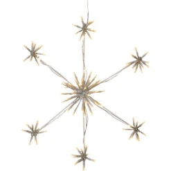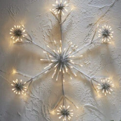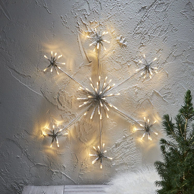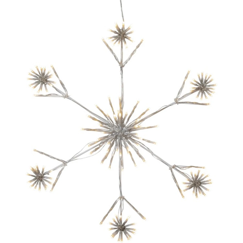 The large snowflake is 60 cm wide, 60 cm high and has a total of 144 LED lights. The light points are spread over the 6 corners with 18 lights in each cluster, plus a larger cluster of 36 lights in the middle of the snowflake.