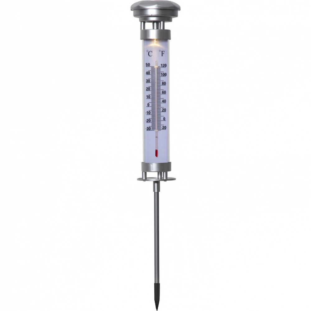 This large outdoor thermometer with a solar cell light makes sure you can easily check the temperature even when it is dark outside. The large outdoor thermometer shows the temperature in both Celsius and Fahrenheit and will look perfect placed in the flowerbed, on the lawn or in a large pot on the balcony.