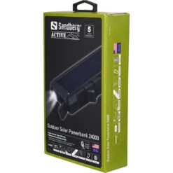 Charges a smartphone up to 9 times 88.8 Wh. Two USB A outlets (2 A / Quick Charge 3.0: 5V/3A, 9V/2A, 12V/1.5A). One USB C outlet (3A). Solar panel 2.0 W/400 mA. Flashlight: 1 strong LED lamp. Measurements: 180 x 89 x 30 mm. Weight: approx 550 g.