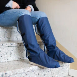 The rain cover is fastened around the legs with four strong Velcro straps and held in place with a strap under the shoes. The waterproof material protects the sides and tops of your shoes and your lower leg up to the knee. If you wear waterproof trousers, there won’t be a gap between the shoe and the trousers so you don’t get water in your shoes.