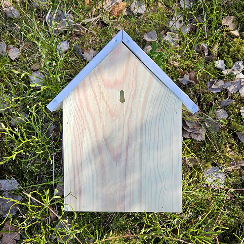 The squirrel house should sit a few metres off the ground. Make sure that at least one of the escape routes is close to a branch. The squirrel house has a keyhole attachment at the back. You can either hang the squirrel house on a nail or screw, or tie it around a tree.