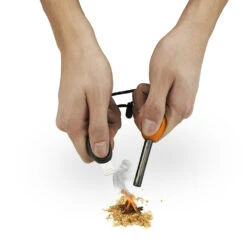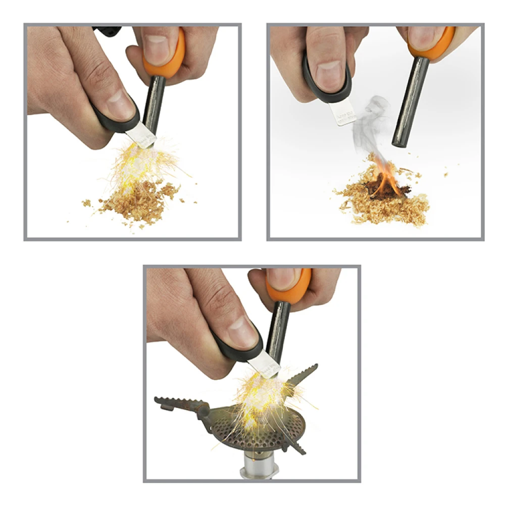 Hold the striker against the ignitor’s magnesium alloy and bring the striker down slowly but firmly. The friction creates sparks that are 2980° C warm that will light up whichever tinder you choose to use. The spark ignitor can be used approximately 12,000 times and works in both rain and snow.