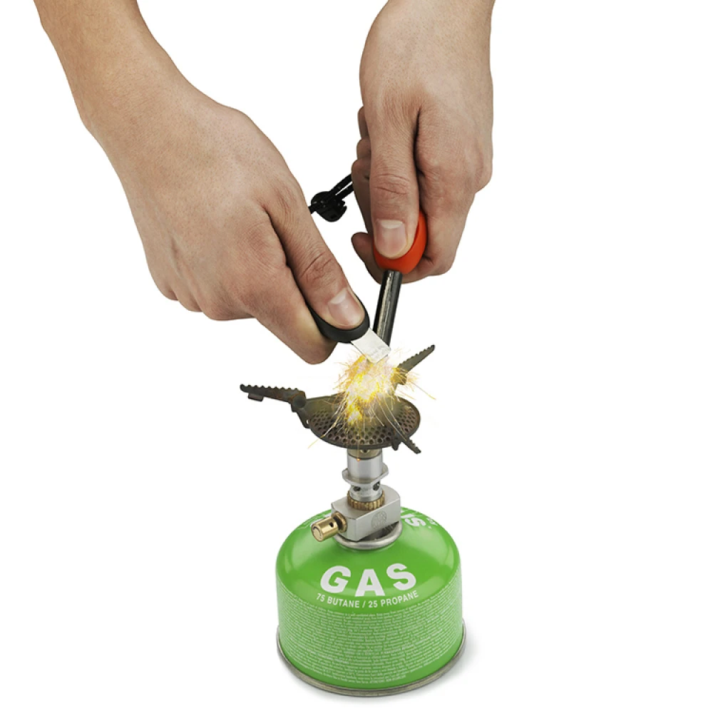 The ignitor and the striker are small and practical, easy to store in your luggage or backpack as they only weigh a few grams each. The striker’s handle also has a whistle which could be useful in case of an emergency. The spark ignitor can also be used to light camping stoves, gas-stoves and gas grills.