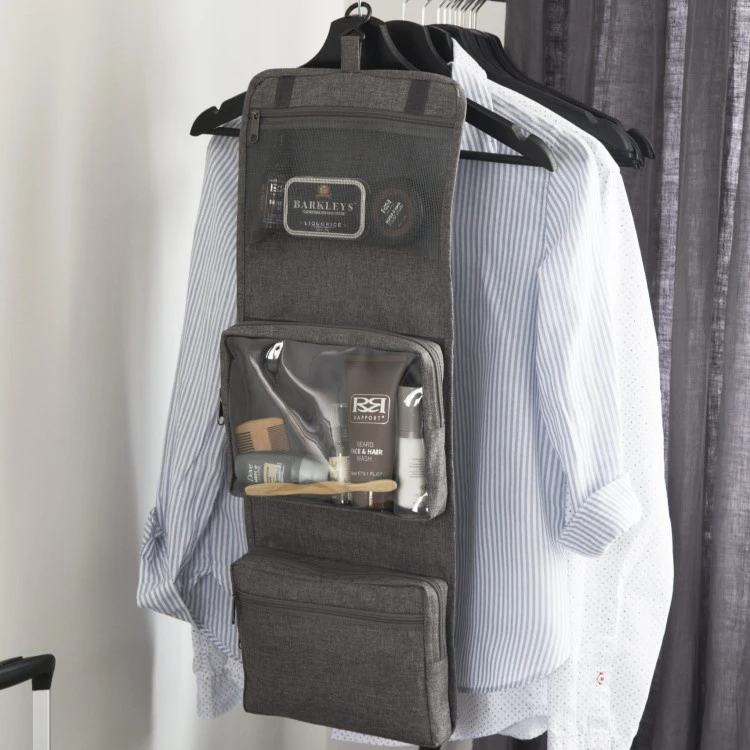 When you get to your hotel room, you can unfold and hang up the bag with the integrated hanging hook. Hanging it on a hook or coat hanger gives you easier access to all pockets and compartments. The mesh pocket and transparent plastic window also make it easy to see what you’ve packed.