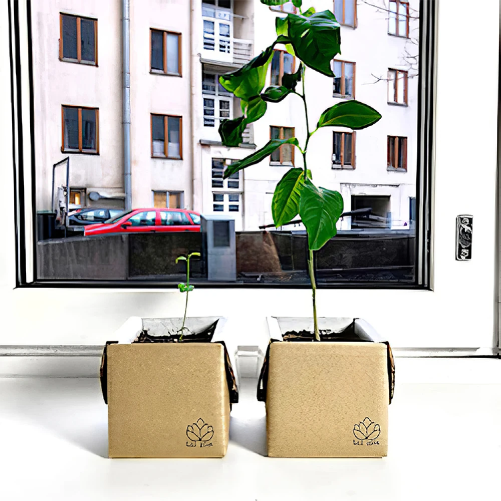 Fold the waterproof cultivation box, fill it with the soil and plant the seeds. The packet comes with several seeds that you can plant into numerous trees! The trees are relatively low maintenance but sensitive to over watering at the start. A spray bottle is a great way of keeping the soil moist at the trees’ most sensitive stages. If you get more than one tree growing in the cultivation box you can easily relocate one to another pot once it starts growing more than two leaves. Of course you can choose to leave them both in the box but it will be harder to relocate them once the roots start getting tangled.
