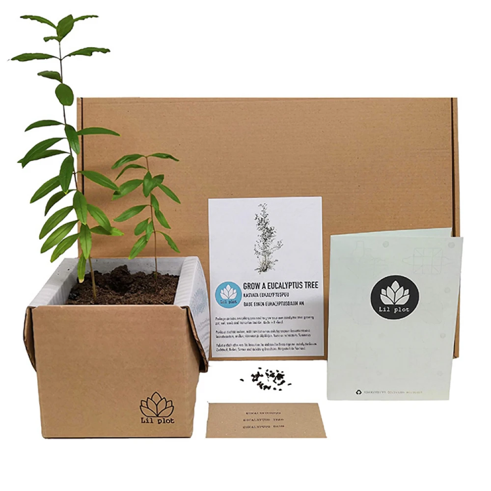 The kit comes with seeds, nutrient-dense soil, a waterproof cultivation box and a cardboard box that you plant the tree in. The different trees available in this kit are: eucalyptus,lemon and pomegranate. All the different trees are just as beautiful and have different perks. The eucalyptus tree gives a refreshing smell to your home and the lemon and pomegranate trees can start growing fruit within a year!