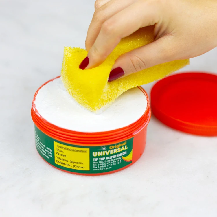 The Universal Polish is concentrated and very long-lasting. Wet a sponge with water and apply the Polish. Build up a lather, clean your surface and, when you’re done, rinse with water and wipe dry with a clean towel. ATTENTION! Do not polish with the paste, only with the lather!