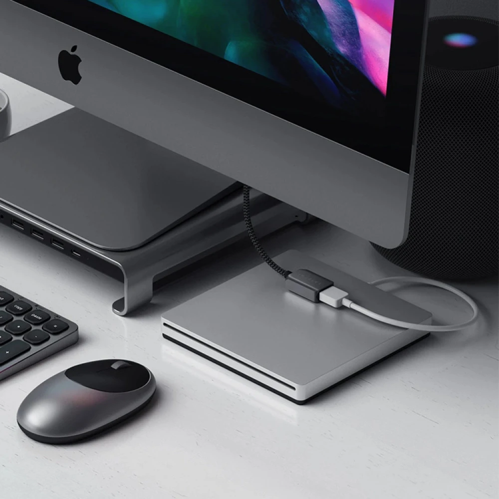 With a USB-C to USB adaptor, you can plug your old phone, mouse, hard drive or keyboard into your new computer’s USB-C port. The adaptor allows you to use, charge and transfer data between devices as usual, and its slim design means it doesn’t block nearby ports when the adaptor’s connected to the computer.
