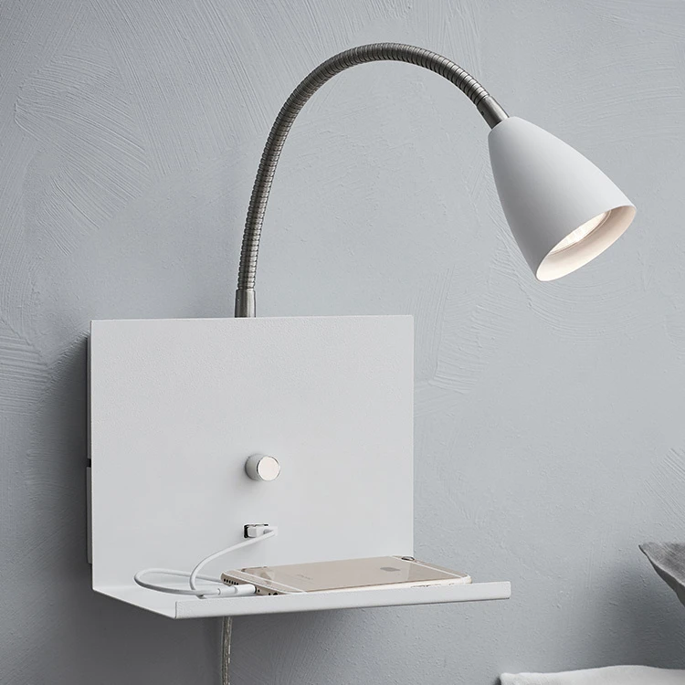 This practical wall-lamp has a built-in USB port and a practical shelf. Perfect for your reading corner or next to your bed where you can place your mobile phone away from your books, jewellery or glass of water. Great for de-cluttering!
