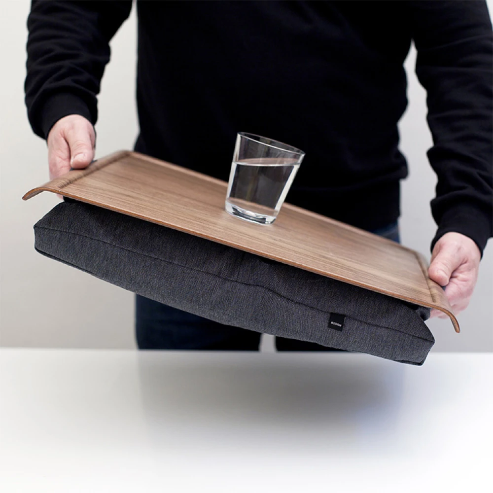 Enjoy an amazing breakfast in bed or use your laptop on this luxurious tray in walnut! The tray is fixed on a grey cushion made of 100% cotton, and with the anti-slip surface, the items you place on the tray won’t slip away.