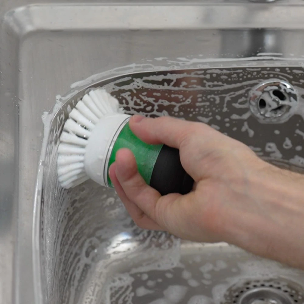 Washing-up is a little easier with a smart washing-up brush which easily gets into pots and anything else, and which also has a pump containing washing-up liquid. Just the right number of strong nylon bristles easily and effectively scrubs clean dishes, pots and pans for all surfaces, including non-stick pans.