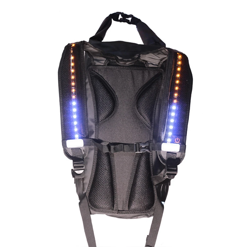 The backpack is made of durable, waterproof PVC, and has many reflective surfaces to make you visible, in addition to the lights. Close the backpack by folding the opening edges 2-3 times and securing with the clasp.