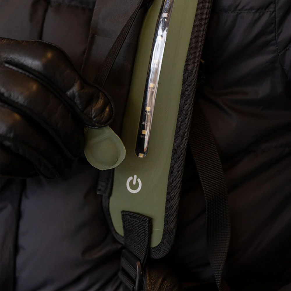 You turn the lights on and off by holding down the small disc above the ON button on the left shoulder strap. When the backpack is switched on, you can tuck the disc into the small pocket on the left guard on the shoulder strap. The guards on the shoulder straps prevent you from being blinded by the lights. NOTE! You will need a Powerbank of your choice to give the lights power (not included).