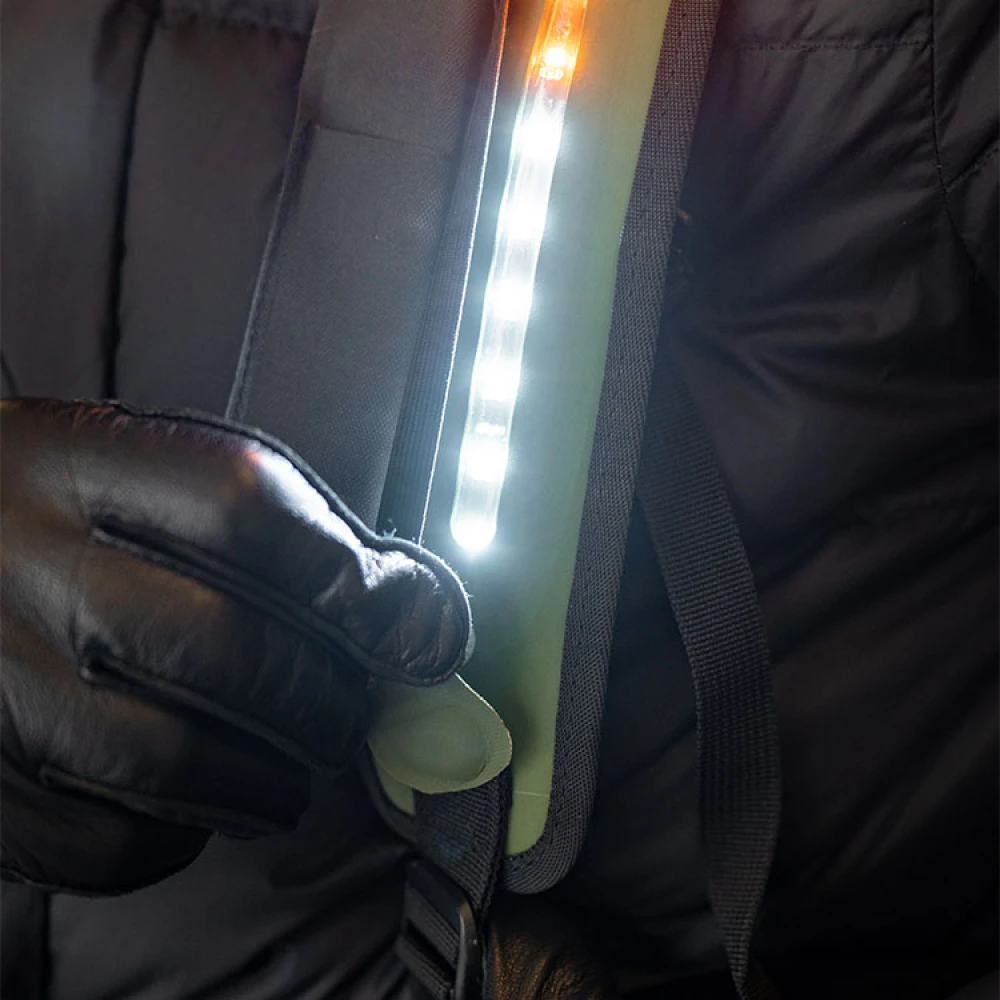 In order to power the lights, you will need to connect the Powerbank of your choice (not included) to the backpack’s integrated USB cable. You can then store the Powerbank in the small pocket at the top of the backpack.