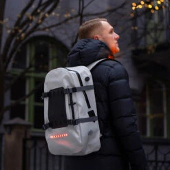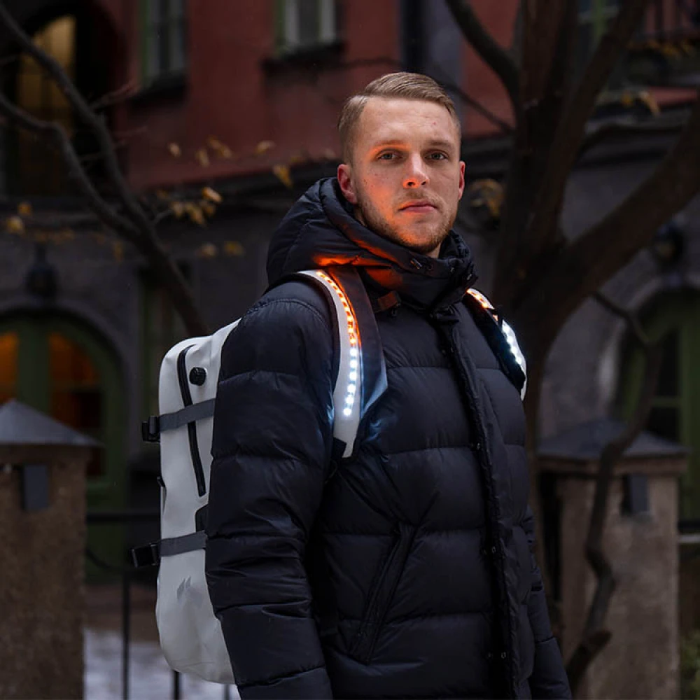 Illumine is a Swedish-developed waterproof backpack with built-in LED lights that make you visible to traffic. The lights are on flexible LED strips and light up in red on the back and in orange and blue on the front of the shoulder straps.