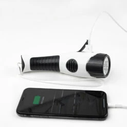 The rechargeable battery can also be used as a powerbank for your phone or other rechargeable devices. The battery is powerful enough to bring a USB device back to life and give its battery a basic charge. And you can always keep the torch’s battery charged by turning the dynamo crank.