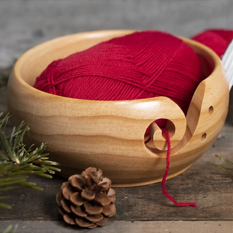 Smart and practical wooden yarn bowl with useful holes that keep the yarn ball in place in the bowl when knitting or crocheting. The wooden yarn bowl is made of lacquered pine and keeps things neat and tidy.